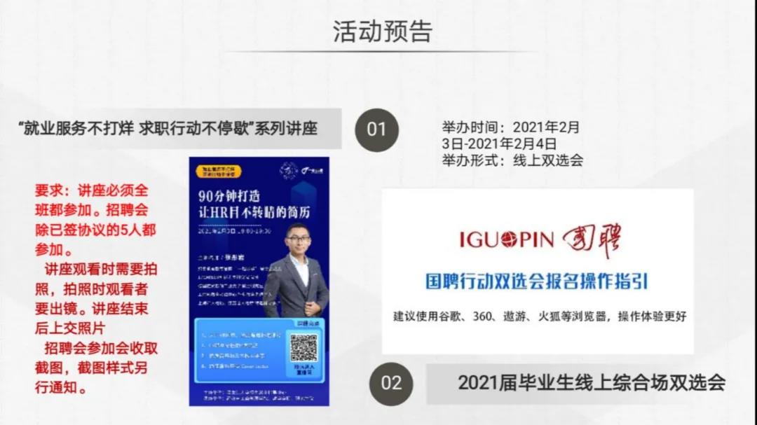 为落实好工作要求,随后公司2021届毕业生以班级为单位相继召开了线上就业工作促进会。根据各班级实际情况,有针对性的从考研复试筹备、考研成绩等待期心态调整、就业信息获取、就业技能提升、基层就业项目等方面进行介绍。并有针对性的邀请已毕业的学长、学姐;本班级率先签订协议的同学进行经验交流和分享。