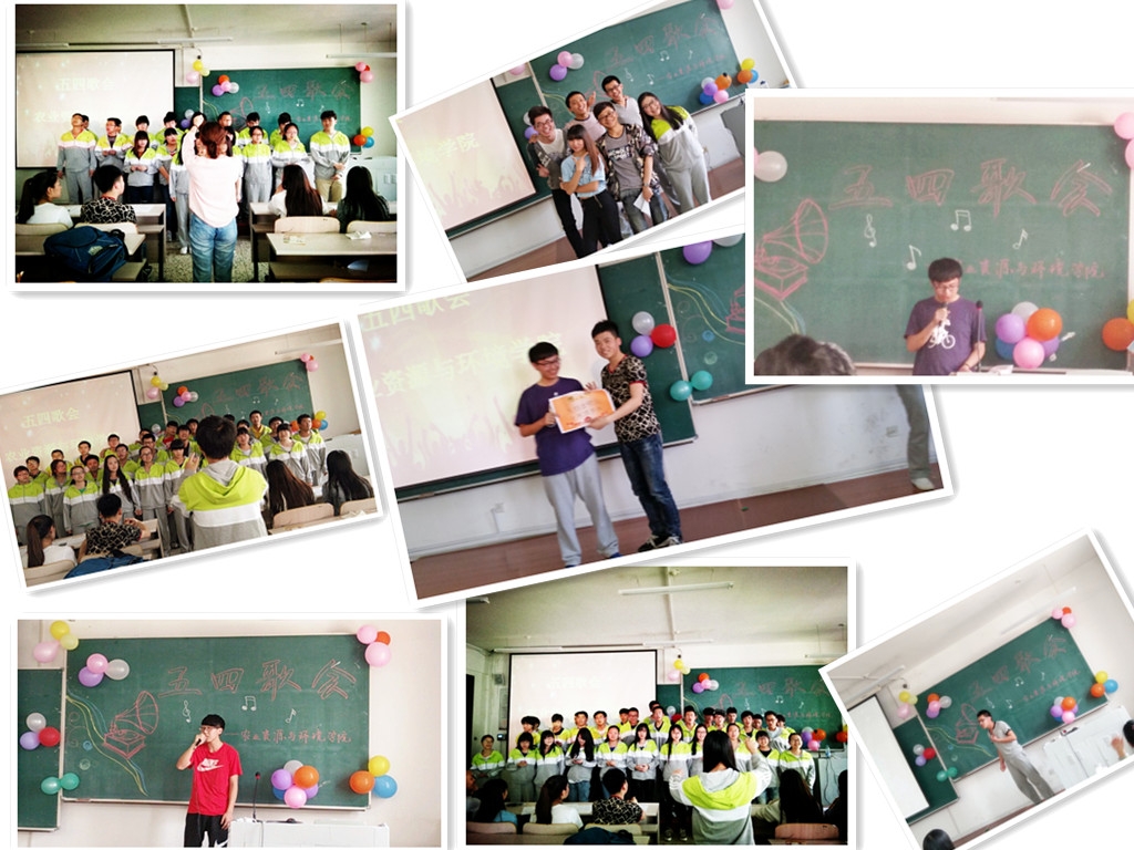 在个人才艺展示中间还加入了一个有趣的小游戏,叫“你听我猜”。工作人员播放经典的红色歌曲让同学们猜歌名,因为这个小游戏同学们可真是抢破了头呢。最后一个环节是全体同学齐唱共青团团歌《光荣啊,共青团》。在一片热烈和谐的氛围中本次歌会的所有环节结束了,经过工作人员的统计农业资源与环境好、专业一班以137分获得本次歌会的先进班集体称号。李晓峰颁奖,班长王春垚上台领奖并发表了获奖感言。