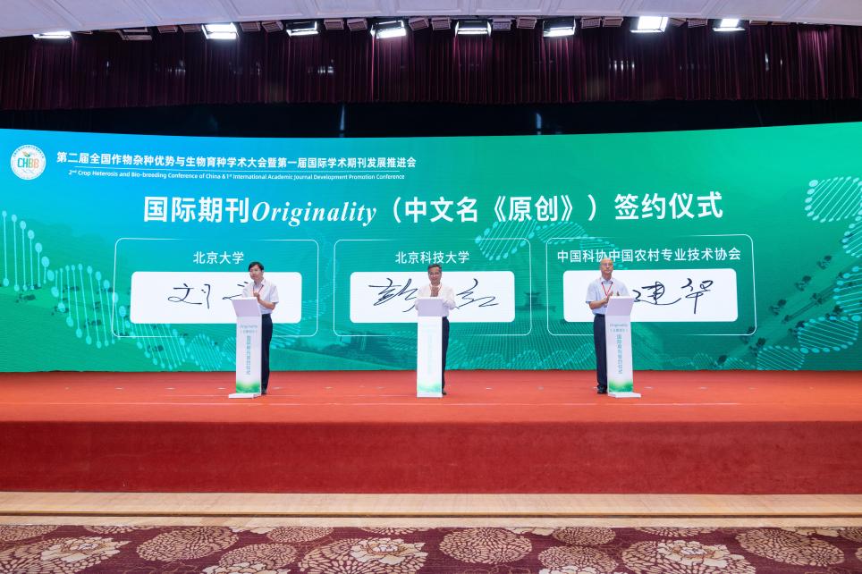 在《原创》期刊签约环节,期刊主办单位代表北京科技大学彭庆红副董事长、北京大学刘永经理,中国科协中国农村专业技术协会党委书记、副理事长张建华共同登台签约创刊。