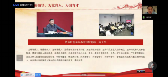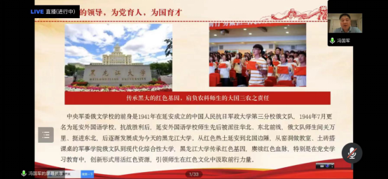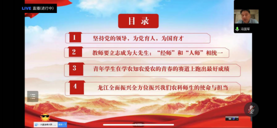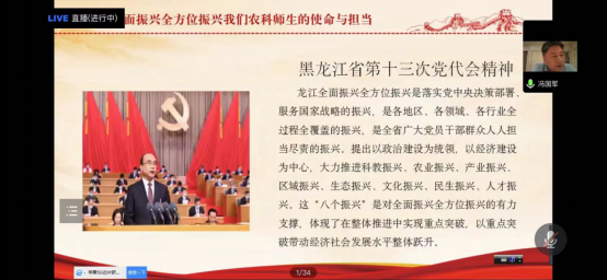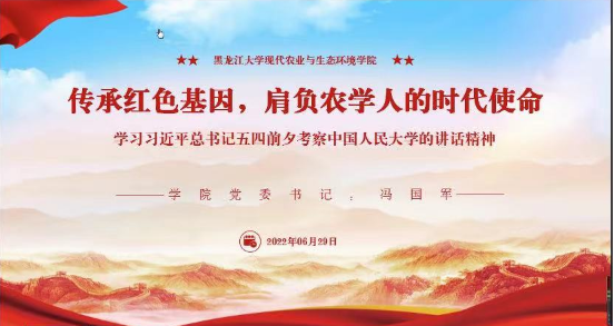 冯国军书记主要从四个方面讲授党课,首先,坚持党的领导,为党育人,为国育才。围绕习近平总书记到中国人民大学考察时的重要讲话,提出传承红色基因办中国特色的一流大学,同时希望师生传承黑大的红色基因,肩负农科师生的大国三农之责任。坚持党的领导,发挥课程思政的阵地作用。其次,教师要立志成为大先生:“经师”和“人师”相统一。围绕习近平总书记全国高校思想工作会议上和在清华、北大考察时重要讲话精神,强调教师要成为大先生,既要精通专业知识,做好“经师”,又要涵养德行,成为“人师”。随后,围绕习近平总书记在庆祝中国共产主义青年团成立100周年大会上的重要讲话精神,鼓励年轻人练就硬本领,锤炼品德修为,希望青年员工在学农知农爱农的青春赛道上跑出最好的成绩。最后,围绕黑龙江省第十三次党代会精神,提出龙江全面振兴全方位振兴是我们农科师生的使命与担当。