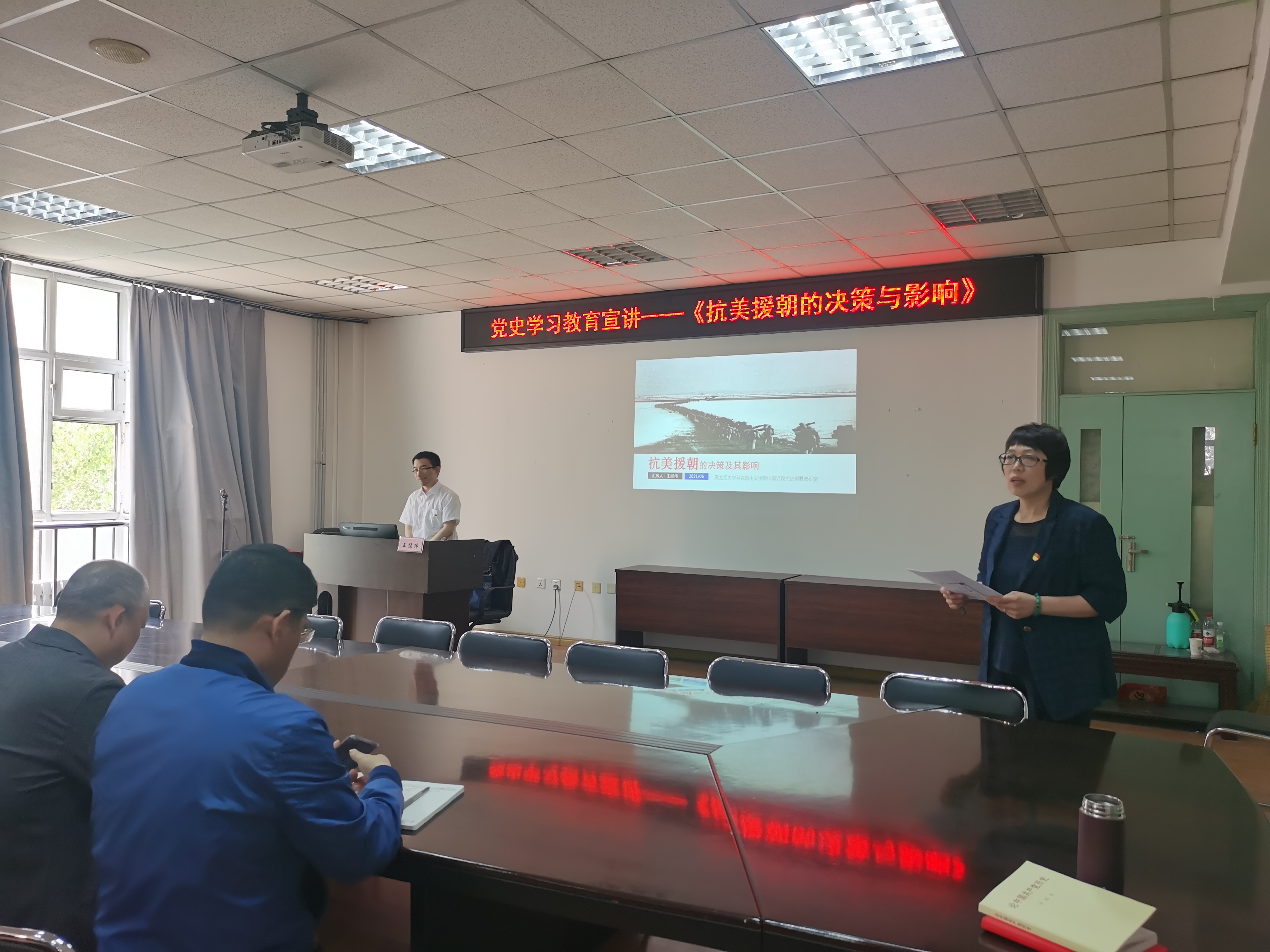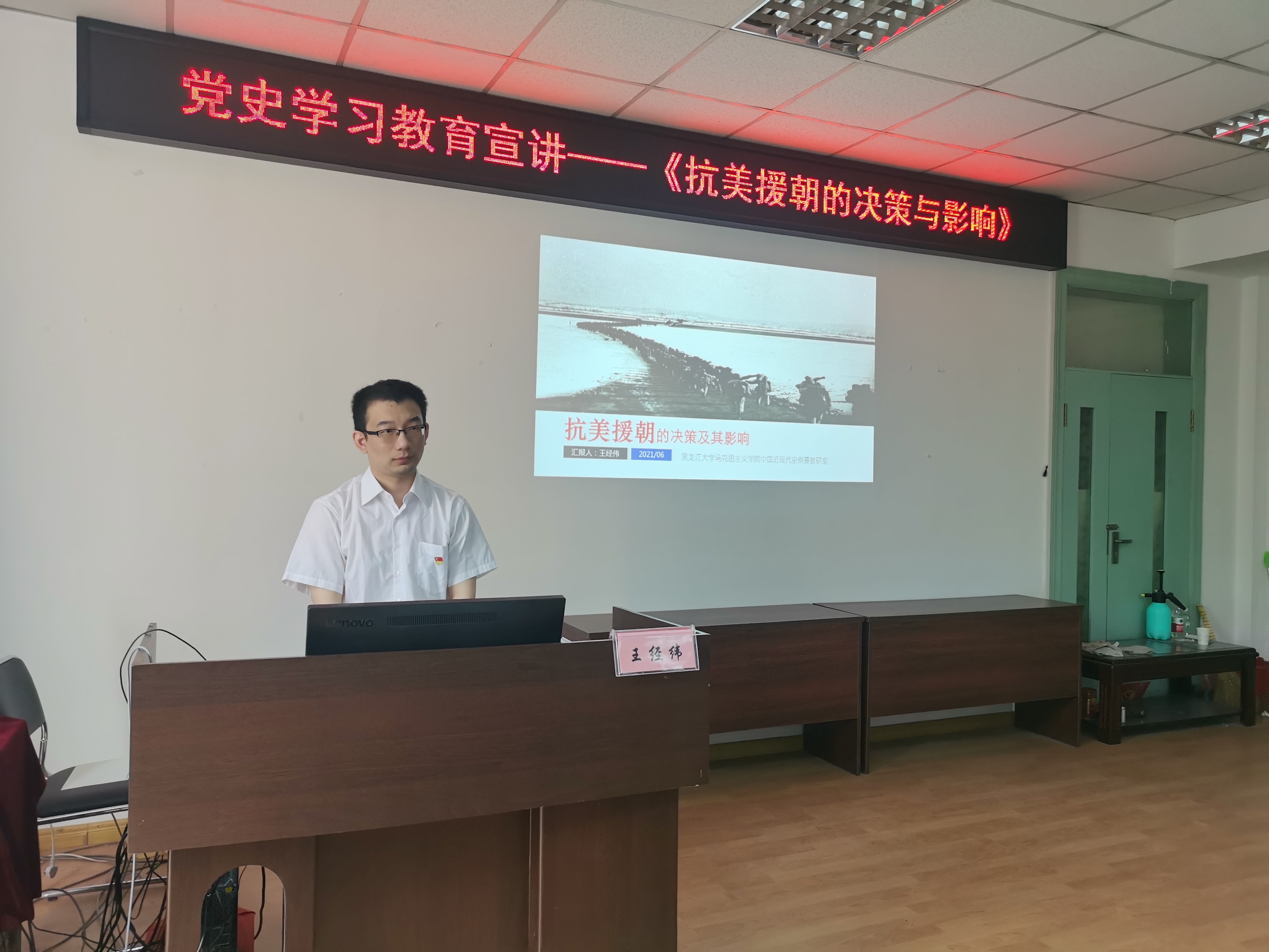 本次宣讲的主题为《抗美援朝的决策及其影响》,王老师以时间为主要脉络,为我们深入浅出地从朝鲜半岛的分裂到艰难的抗美援朝决策,再讲到其影响与启示,让我们深刻地了解到,抗美援朝战役打出了国威、军威,极大提升了新中国的国际地位,成为任何人都不敢轻视的重要政治和军事大国,这次战役人民军队取得了进行现代化战争的经验,而最重要的就是党的领导和人民的支持才是战役胜利的保障,帝国主义侵略者应当懂得:现在中国人民已经组织起来了,是惹不得的,如果惹翻了,是不好办的!!