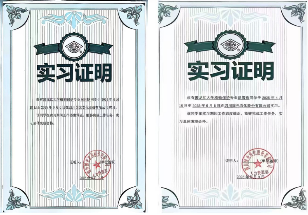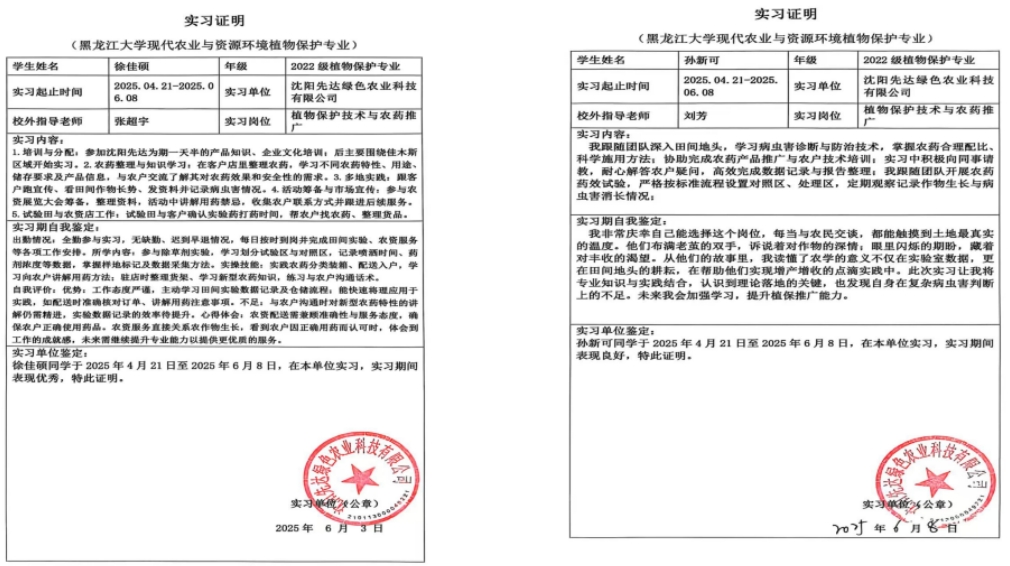 4月21日起,54名员工分别奔赴四川国光农化股份有限公司(9人)、山东先达股份有限公司(6人)、四川龙蟒福生科技有限公司(7人)以及黑龙江省农科院4个研究所(32人:植保所7人、玉米所5人、草业所8人、经作所12人),进行了植物保护技能实践、技术推广、技术咨询、技术服务、技术管理及技术营销等方面实习。除了提供实习岗位配备校外指导教师外,企业岗位为员工提供实习保险、实习工资、食宿补贴、往返路费等;科研院所为员工提供实习保险、往返交通费、实习耗材费、科研平台仪器使用费、劳务费等资金支持。植物保护专业实习生不仅态度端正,同时在实习中展现了三年所学的专业知识,员工的实习表现,获得了校外指导教师良好及以上的好评。